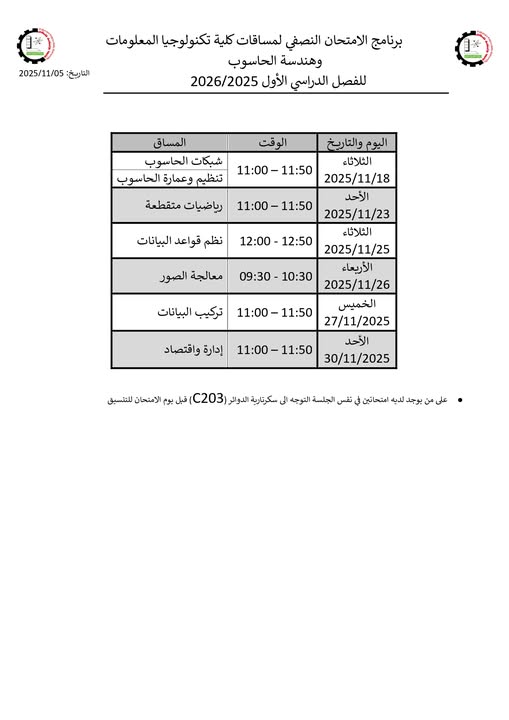 برنامج الامتحان النصفي - كلية تكنولوجيا المعلومات وهندسة الحاسوب - الفصل الدراسي الأول 2025-/2026
